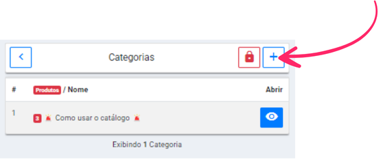 Agora, voc ver as categorias do seu catlogo, por padro ele j ter uma categoria que a nossa equipe de suporte cria para ajudar seus clientes a saberem usar o catlogo. Clique no "+" que aparece no canto superior direito para criar uma nova categoria: