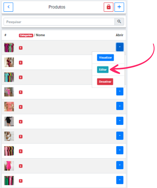 Ao abrir a pagina de produtos voc ver todos os produtos que acabou de subir, clique ento na setinha que est na frente do produto e escolha a opo "editar":