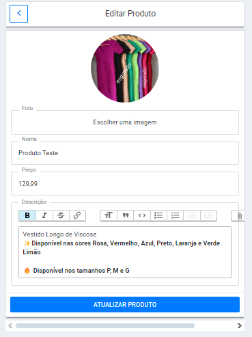 Aps preencher tudo (ou o que achar importante), clique em "Atualizar Produto", veja um exemplo: